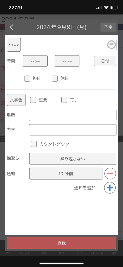 実際に予定を書くときはこちらの画面。